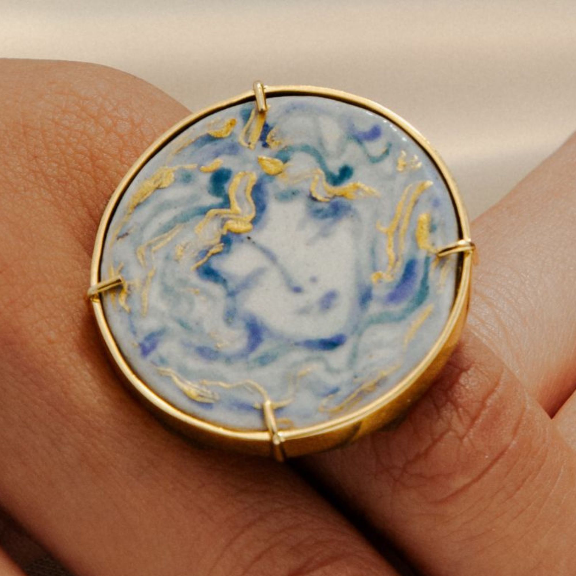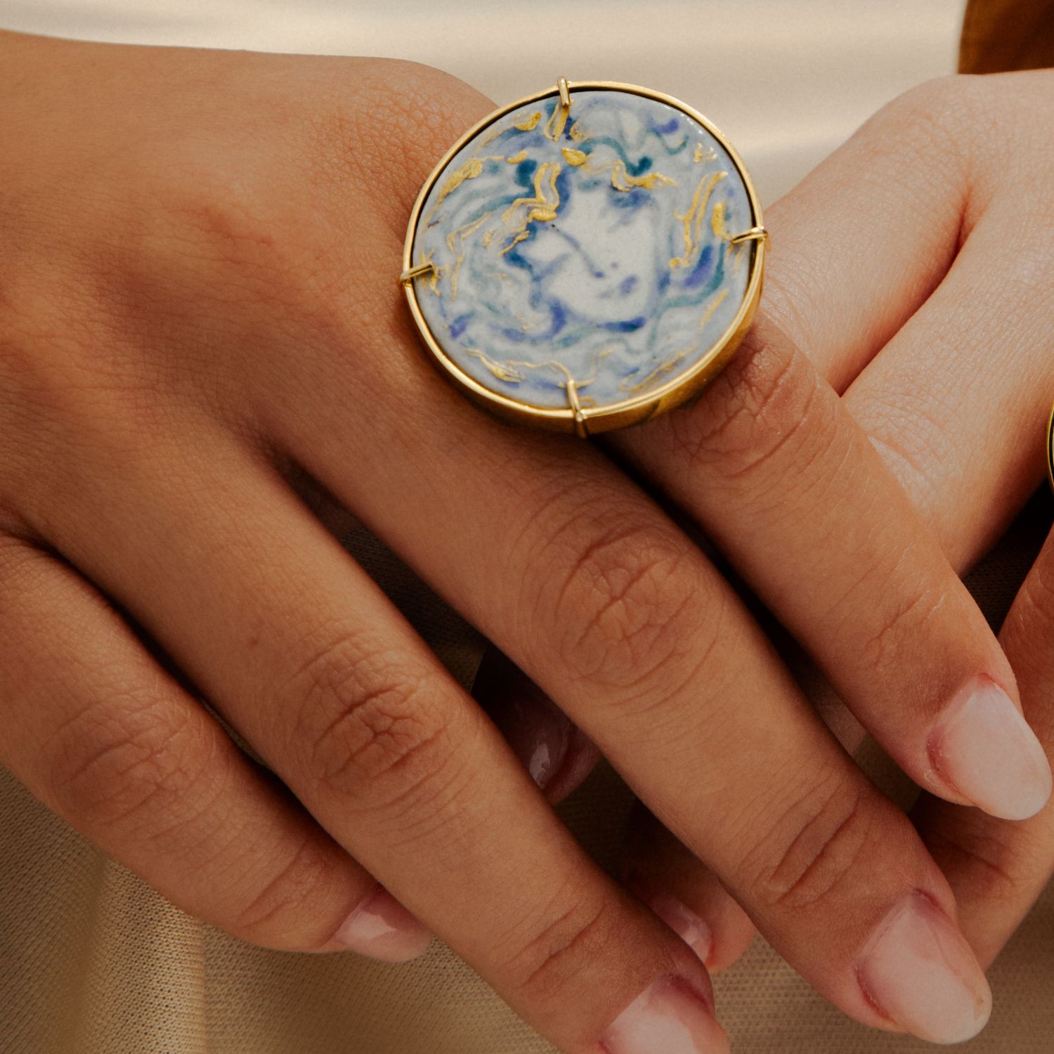 Anel em Prata 925, banho de ouro vermeil 18K e Porcelana pintado à mão.