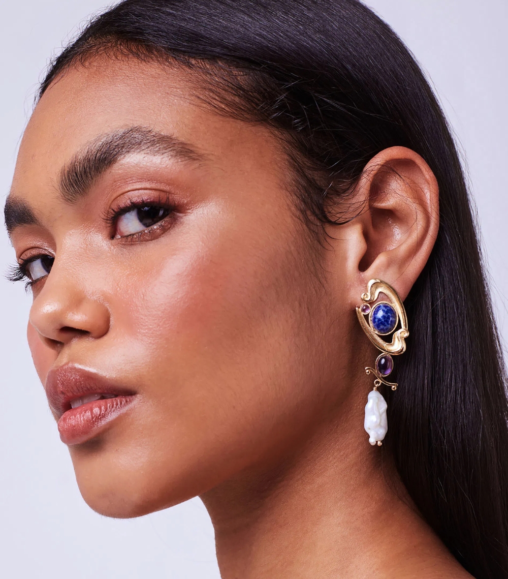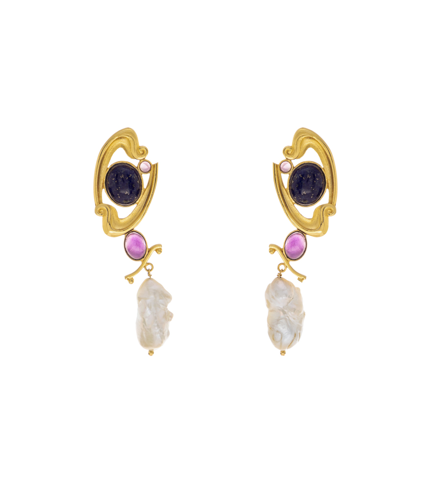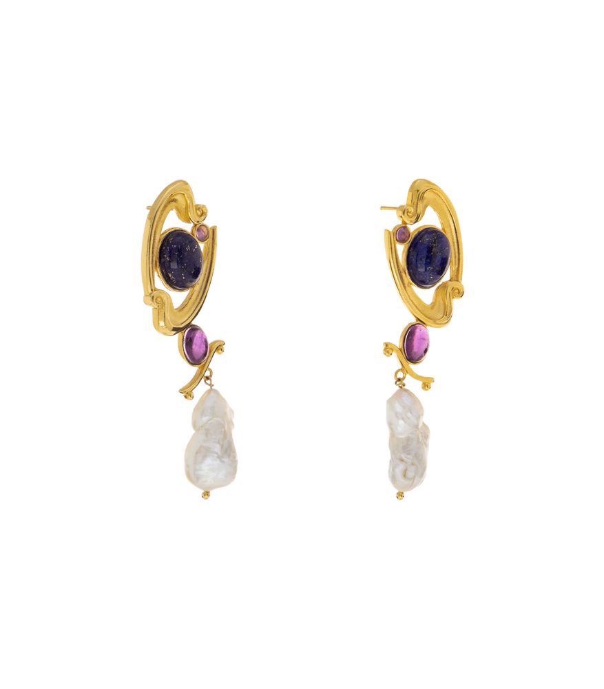 Prata 925 com banho de ouro 18k e pérolas barroca de água doce, pedras ametista e lápis-lazúli.